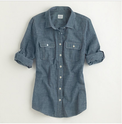 Notably, chambray shirts are the perfect antidote to a look that might be too dressed up. In some cases, a crisp white shirt worn under a more casual, rumpled cardigan might just look too stark. Or with a more casual patch-pocket blazer, for example, the white shirt just might stand out a bit too much, even if it’s a white OCBD. Enter the chambray shirt. In a lighter shade like blue (like the J. Crew option pictured), it works in just as many different outfits as a blue Oxford cloth button-down might work. (See option #1 here for a reminder). If you’ve got a v-neck sweater under a navy blazer, throw a lighter chambray shirt in there to flip the look on its head. Wear it on its own under that same blazer, too.