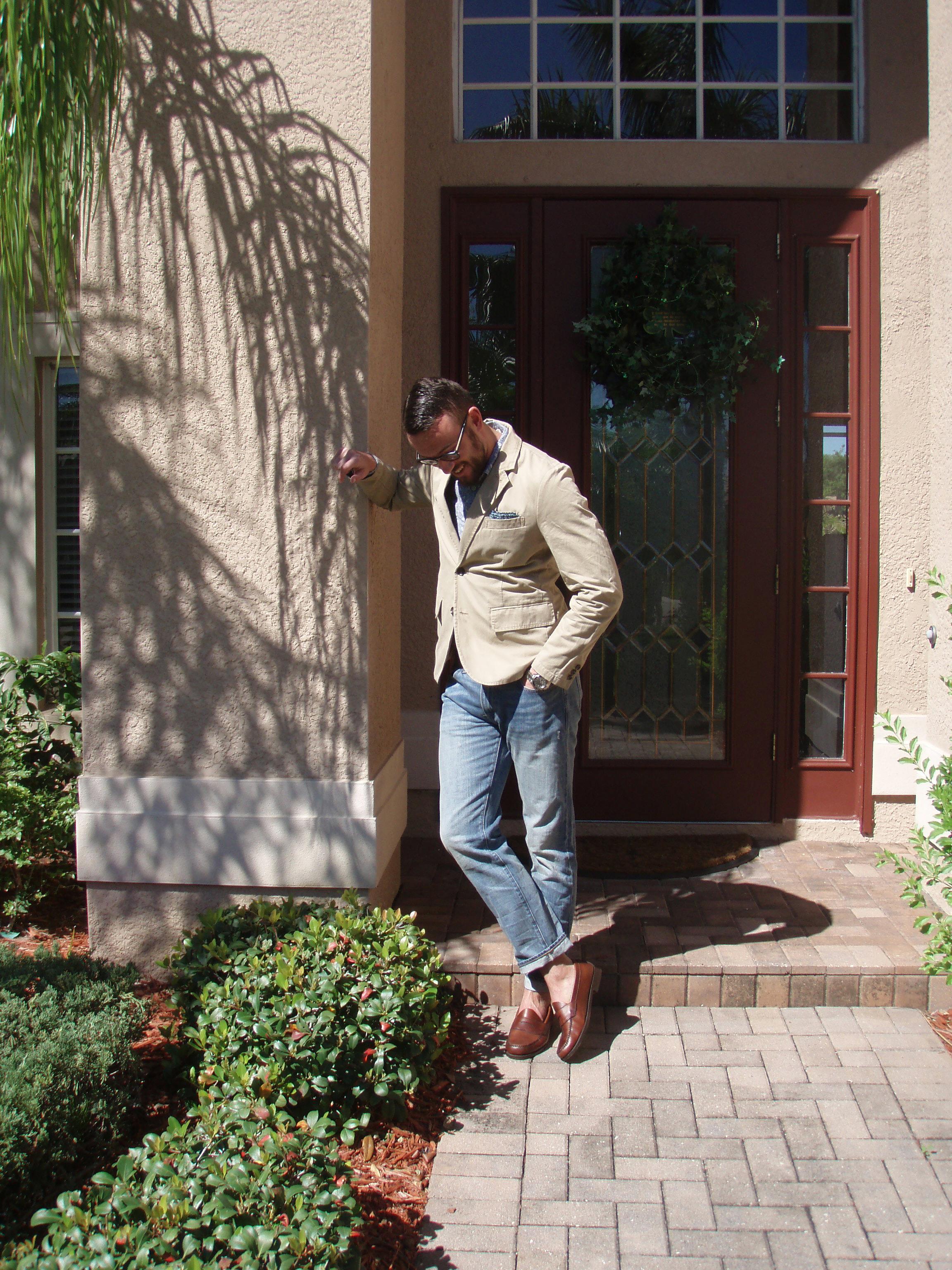 Given spring’s approaching weather, taking  a sharp brown loafer out for a spin with a pair of lightwash denim, as shown above, is a more unique style move than sticking with dark denim or chinos, although both of these certainly could be done as well. The slick leather offsets the more casual, relaxed nature of both the light and the dark denim, so those combos could work interchangeably. The washed khaki chino blazer from Gap (picked up in an outlet store) as pictured is relatively slim off-the-rack, unstructured and easily wearable with a simple printed button-down (something like this Urban Outfitters number could do the trick).