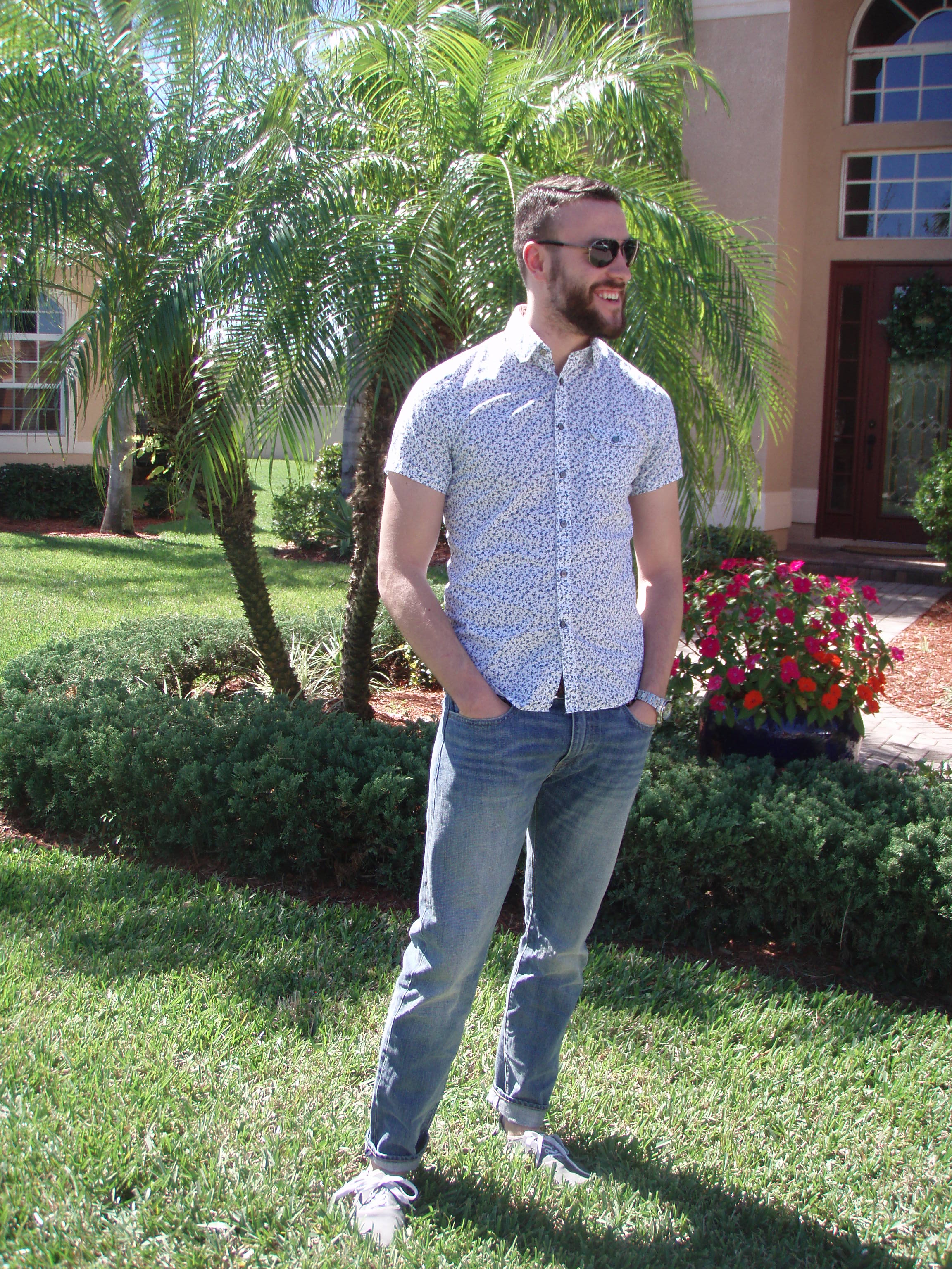 A slightly more unique take on light denim. Floral shirt by Express. Jeans by J. Crew. (484 fit). Canvas sneakers by Urban Outfitters.