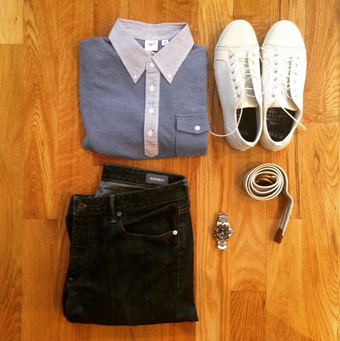 One of the many ways this polo can be styled. Slim dark denim by Bonobos. White sneakers by GREATS. Striped webbed belt by J. Crew Factory. Silver dive watch by Invicta. See more on Instagram.