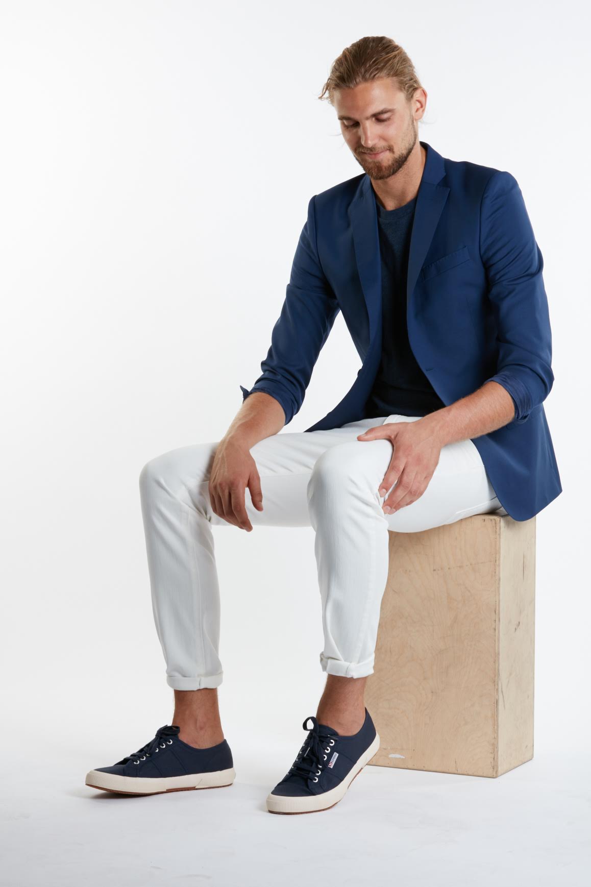 Again, white denim is a pretty bold style move, but the best thing about this set from Mott & Bow is that unlike other designer brands or even smaller merchants like J. Crew, you won’t fork over an arm and a leg (or two legs in this case) to get them. At under $100, these should be a very solid buy. They’re available in a Skinny version featuring a 13 ½” leg opening, as well as Slim & Straight fits. From personal experience with the Skinny version, the style fits remarkably similar to a J. Crew 484 jean or a Uniqlo Slim Fit Stretch jean – and the 2% built-in elastic material in this Mott & Bow pair ensures comfort as you move around in the heat. These look to be the ideal jean to wear with … well, just about anything, from a khaki blazer or a polo to a navy pocket tee (especially the pocket tee) and some some solid leather desert boots. The look in the top photo is particularly crisp yet casual thanks to the navy blazer. Just keep the all-white get-up in the closet unless you fancy yourself a runway model, ehh?