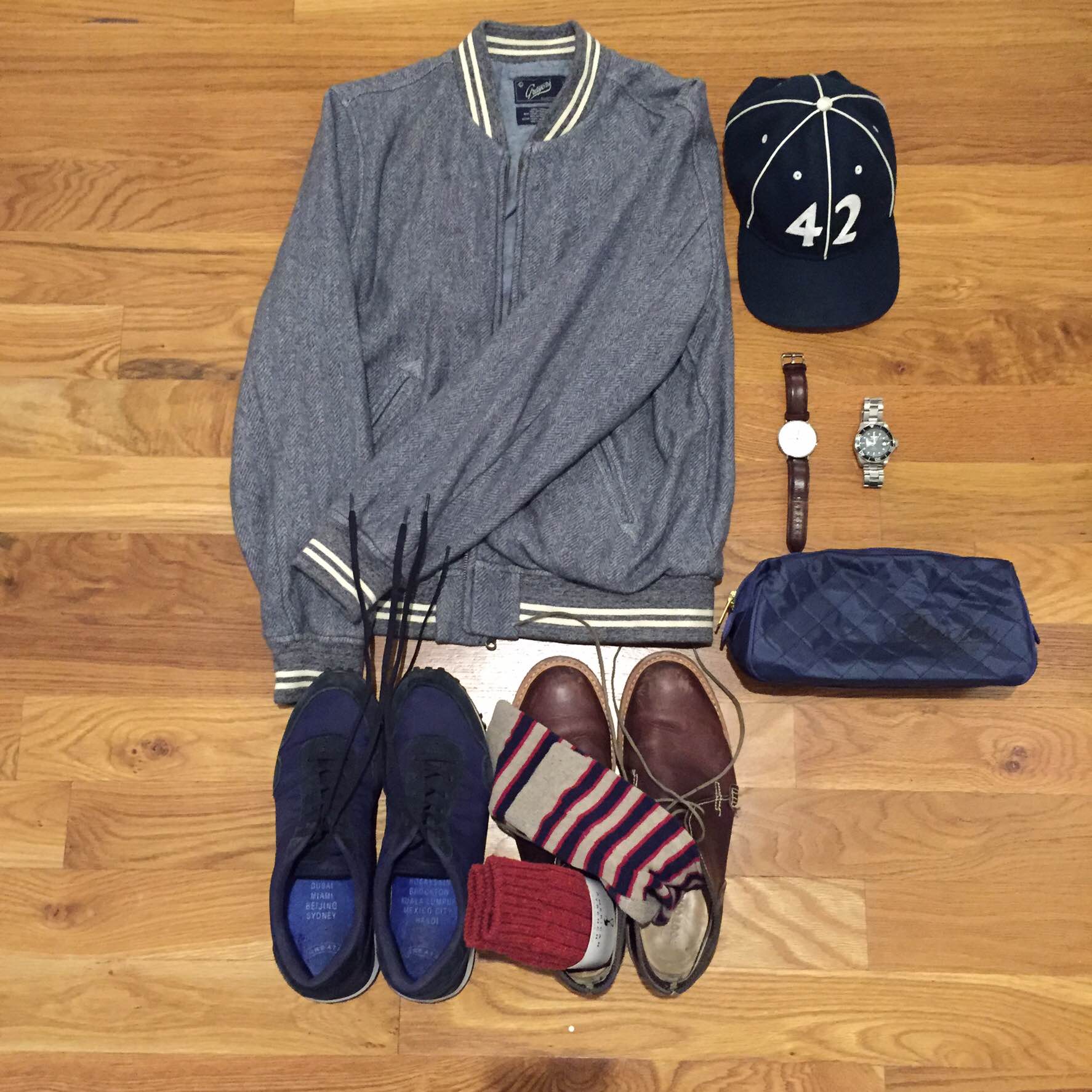 Travel essentials for a cross-country trip. Russel Baseball Jacket by Grayers. Navy sneakers by GREATS Brand. Socks by American Trench. Leather chukka boots by Timberland. Leather watch by Daniel Wellington. Dive watch by Invicta. Vintage ballcap by Goorin Brothers. Dopp kit by Baxter of California.